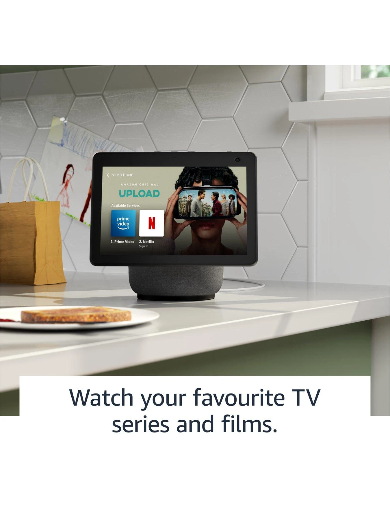 The speakers deliver premium, directional sound that adapts to the space you’re in. See song lyrics, recommendations and album art with Amazon Music, or stream from Apple Music, Spotify, Deezer and more. The HD screen brings your series to life from Prime Video and Netflix (coming soon).