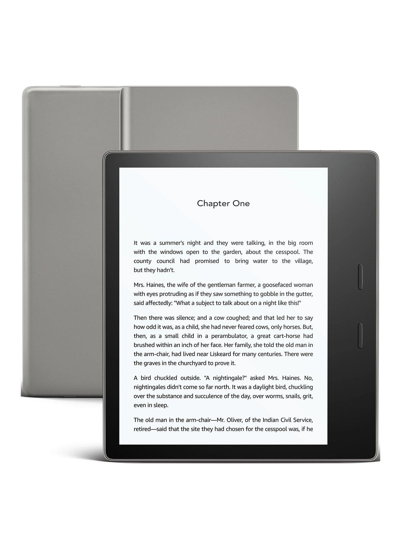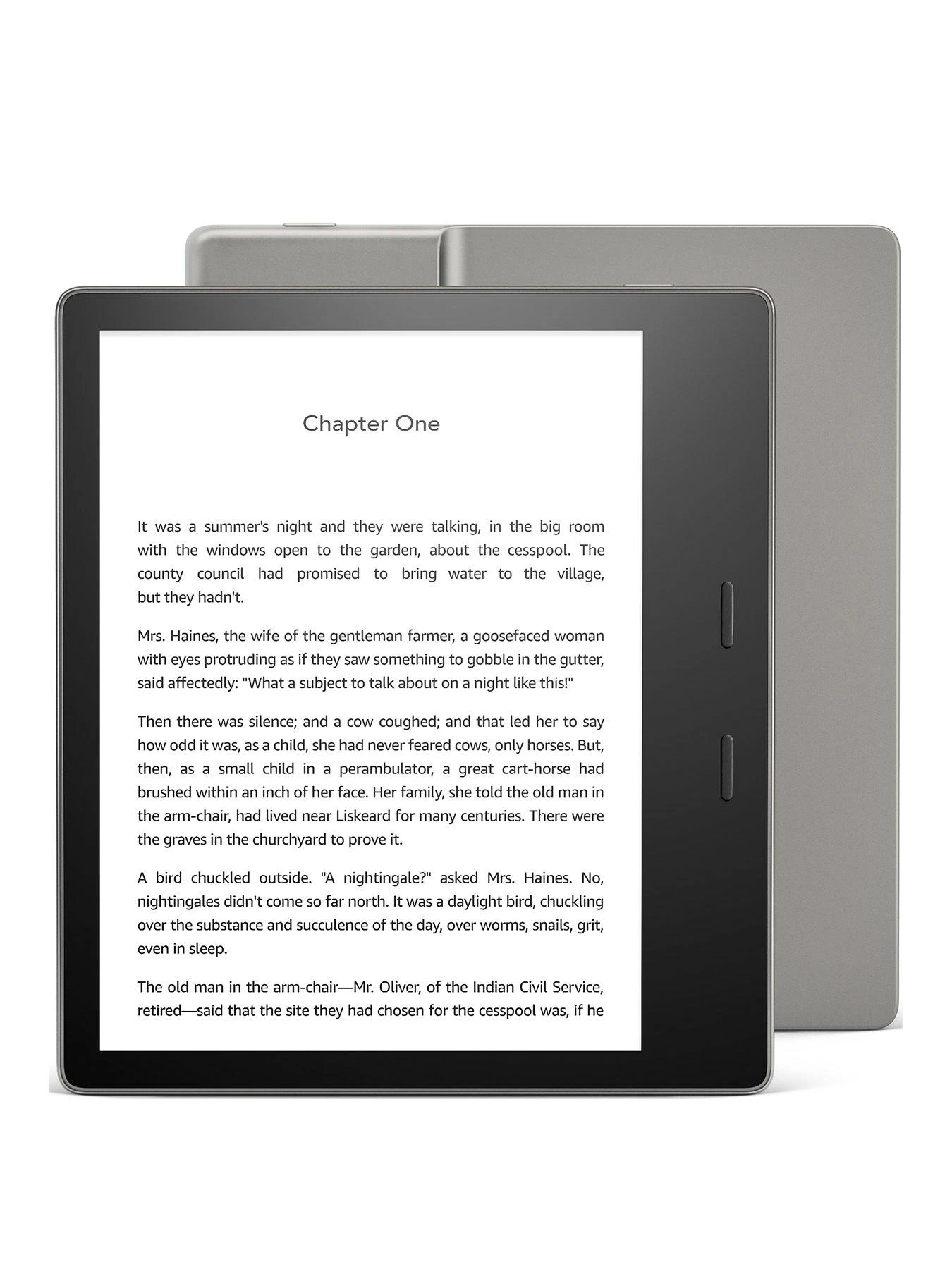 The Amazon All-new Kindle Oasis lets you read comfortably wherever you may be. The most advanced Kindle ever The all-new Oasis features a 7-inch 300ppi display using the latest E Ink technology and a sleek ergonomic design with page-turn buttons, perfect for one-handed reading. Customise your screen Now you can adjust the shade of the screen light from white to a warm amber, with the ability to schedule light changes for a personalised reading experience. Kindle Oasis also has an adaptive front light that automatically adjusts the brightness of your screen based on lighting conditions. Read anywhere No soggy pages with the IPX8 rated Kindle Oasis – it’s built to withstand getting splashed at the beach or dropped in the bathtub, hot tub or pool. It can survive immersion in up to 2m of fresh water for up to 60 minutes. Goes beyond a book Adjust the text size and boldness and read with Kindle-exclusive fonts for maximum readability. Whispersync lets you seamlessly switch between reading and listening without losing your place (requires Wi-Fi or 4G connectivity). Massive Selection Finding new stories has never been easier. Prime members have unlimited access to over a thousand books, magazines and more. With Kindle Unlimited you get access to over one million titles and thousands of audiobooks. The perfect companion Designed by Amazon to perfectly fit your Kindle Oasis, these slim, form-fitting covers attach securely and fold back for one-handed reading. They automatically put your Kindle Oasis to sleep when closed and wake it upon opening, making it easy to get back to your story.