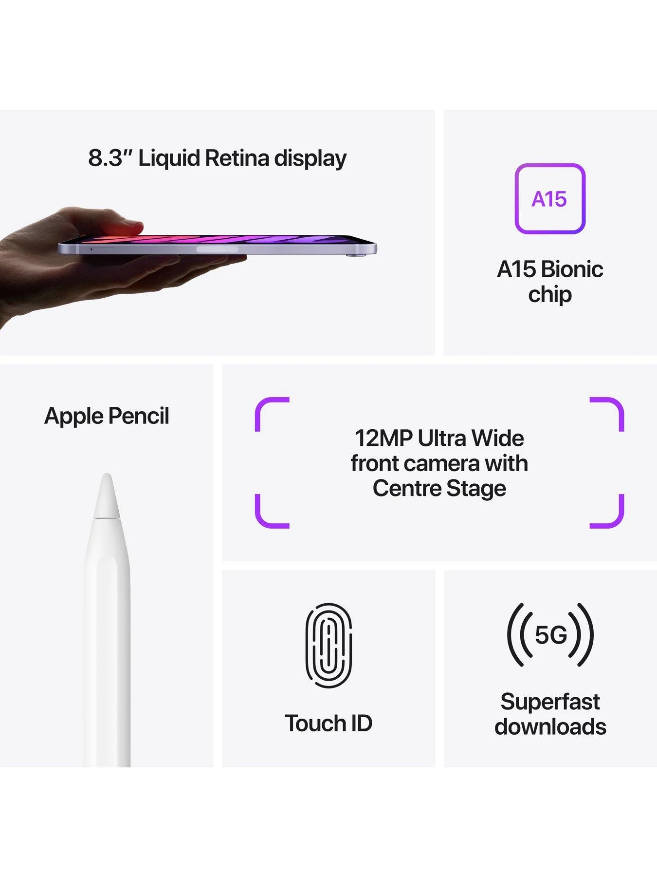 The new iPad mini. Featuring an all-screen design with an 8.3-inch Liquid Retina display.1 Powerful A15 Bionic chip with Neural Engine. A 12MP Ultra Wide front camera with Center Stage. USB-C connectivity. Ultrafast 5G.2 Take notes, mark up documents, or capture your biggest ideas with Apple Pencil (2nd generation) that attaches magnetically and charges wirelessly.3