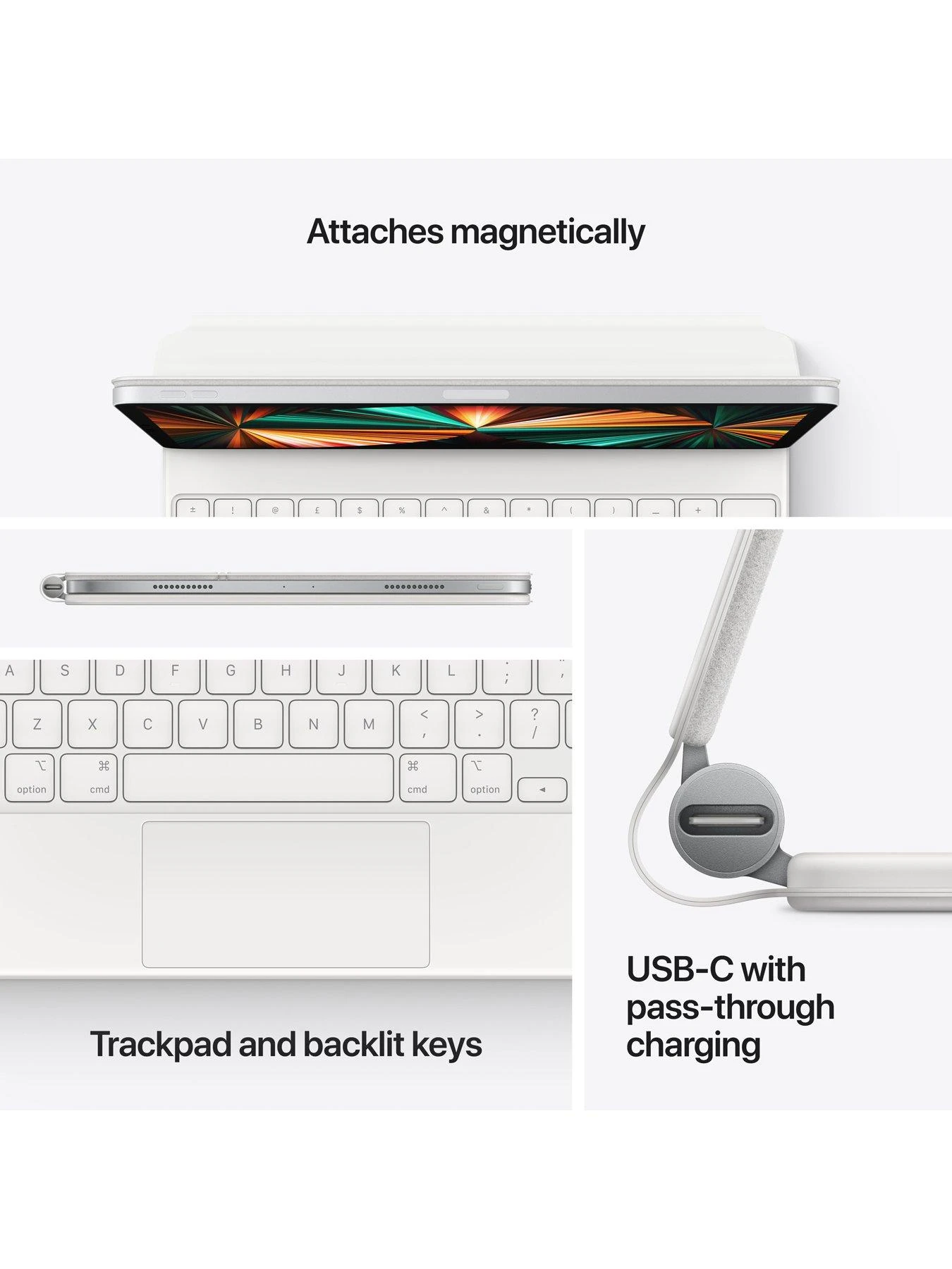 The Magic Keyboard is the perfect companion for iPad Pro, now available in two colours. It features a comfortable, responsive typing experience, a trackpad that opens up new ways to work, a USB-C port for charging, backlit keys, and front and back protection. With a floating cantilever design, iPad Pro attaches magnetically and allows you to smoothly adjust to the perfect viewing angle.