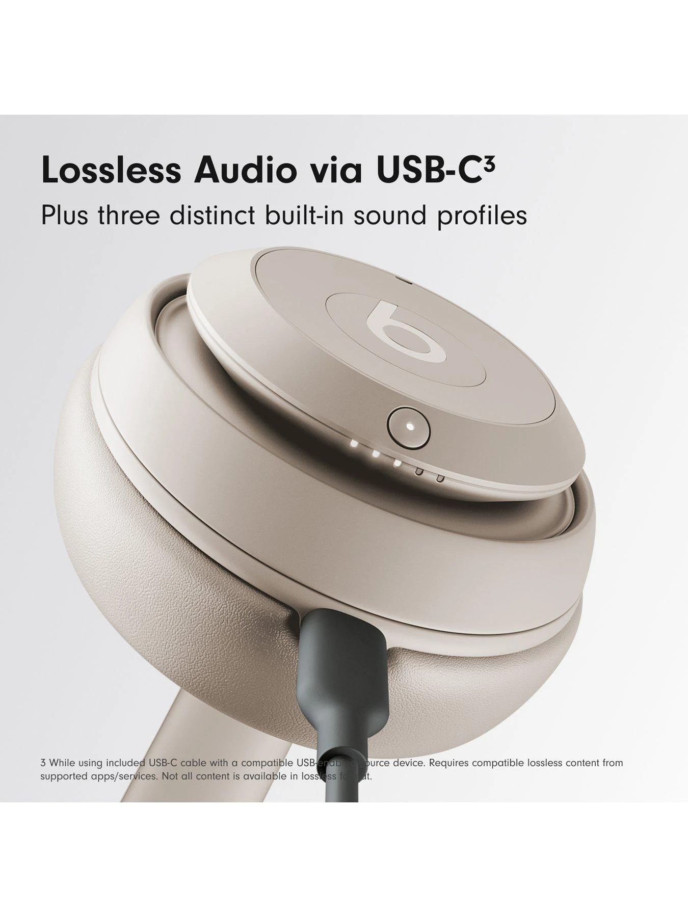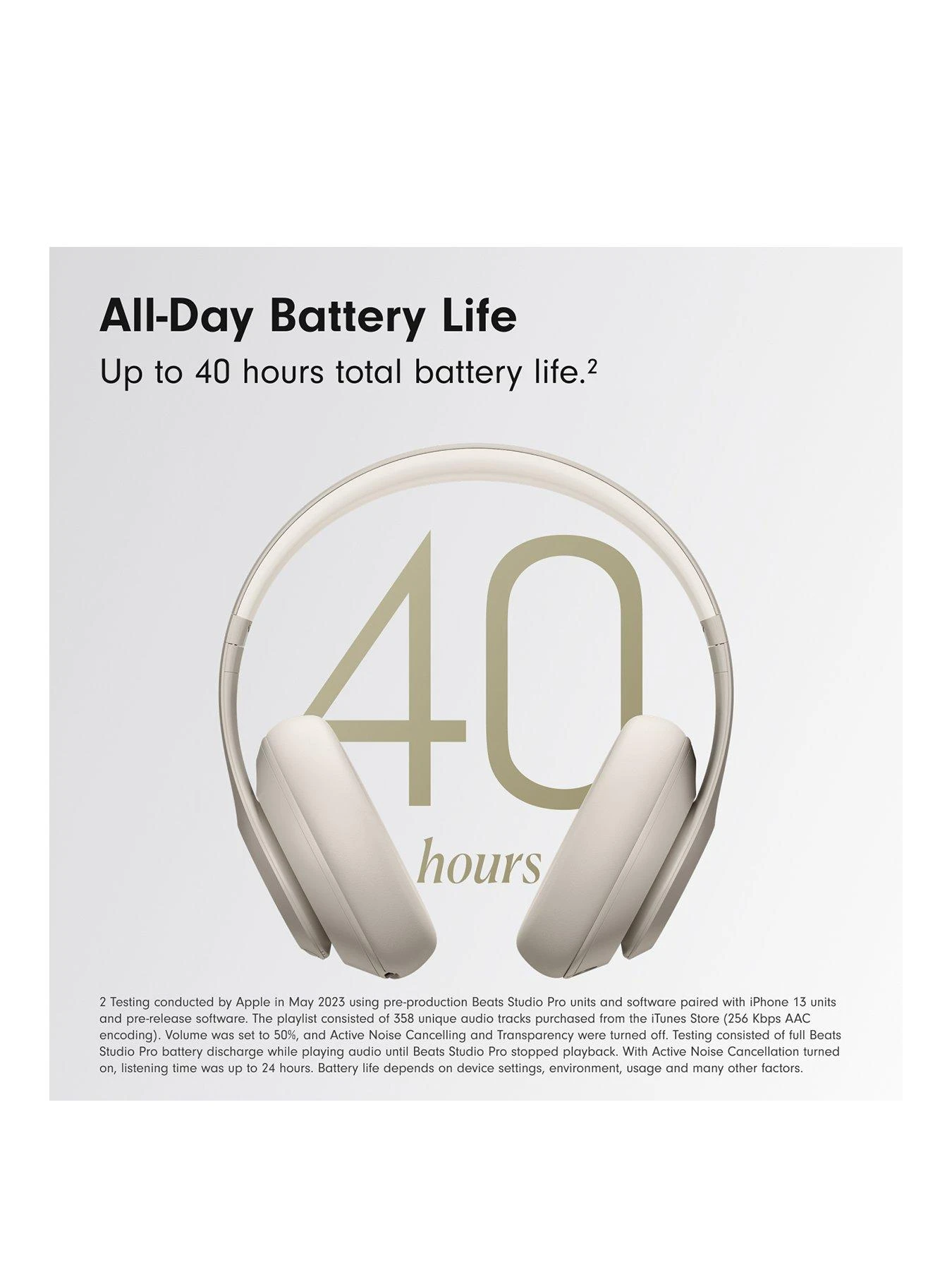 1. Not all content is available in lossless format. 2. Testing conducted by Apple in May 2023 using pre-production Beats Studio Pro units paired with iPhone 13 units. Volume was set to 50% and ANC and Transparency were turned off. Battery life depends on device settings, environment and usage 3. Requires an iCloud account and a compatible Apple device running the latest IOS software or a compatible Android device running Android 8.0 or later, with Google Play Services enabled.Â