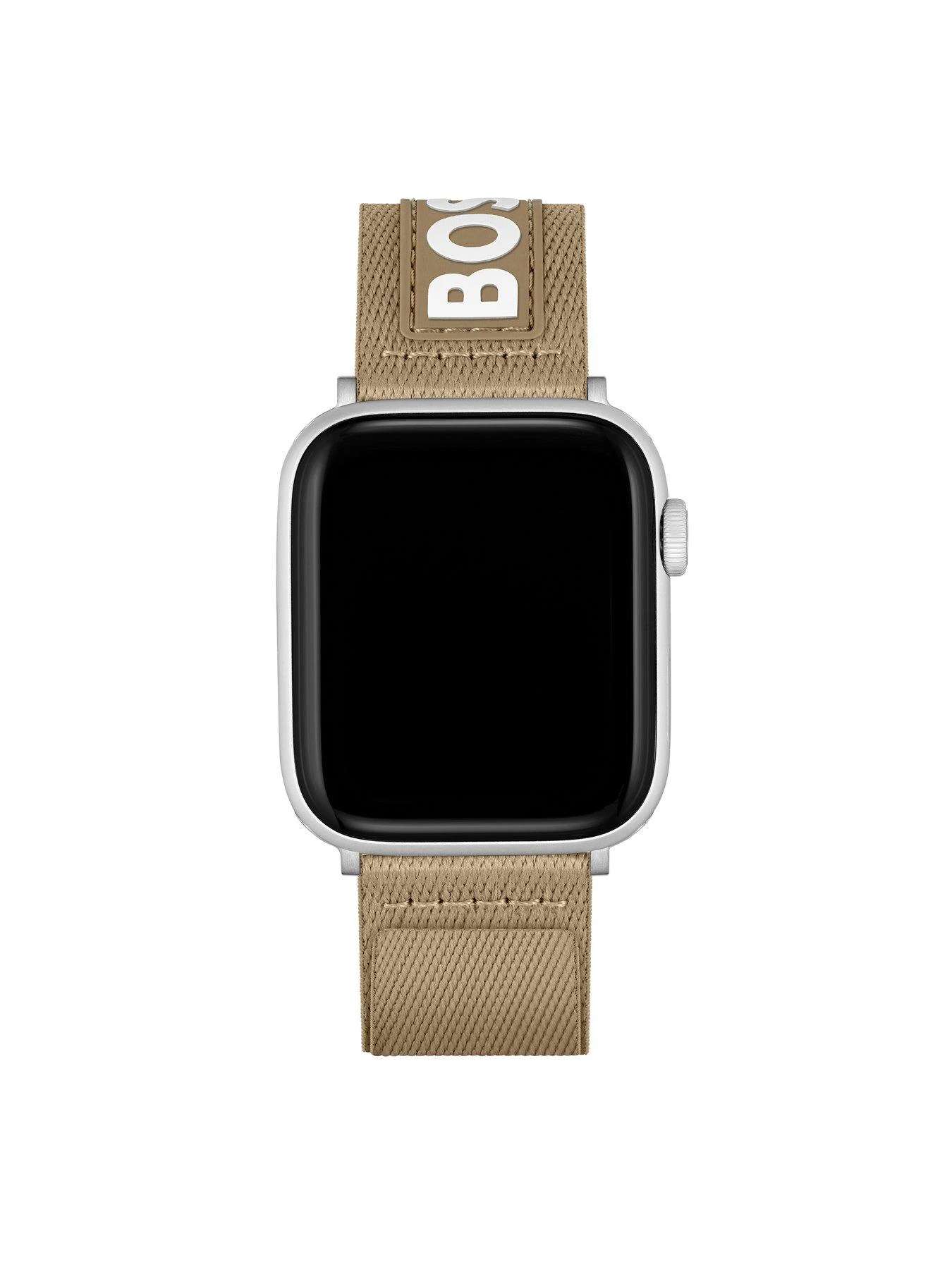 BOSS gents #TIDE Camel Ocean-Bound Apple watch strap. Featuring a camel coloured ocean-bound plastic strap with Velcro closure, stitched silicone piece with white BOSS logo and stainless steel lugs. Made exclusively for use with the 42mm and 44mm Apple watch.