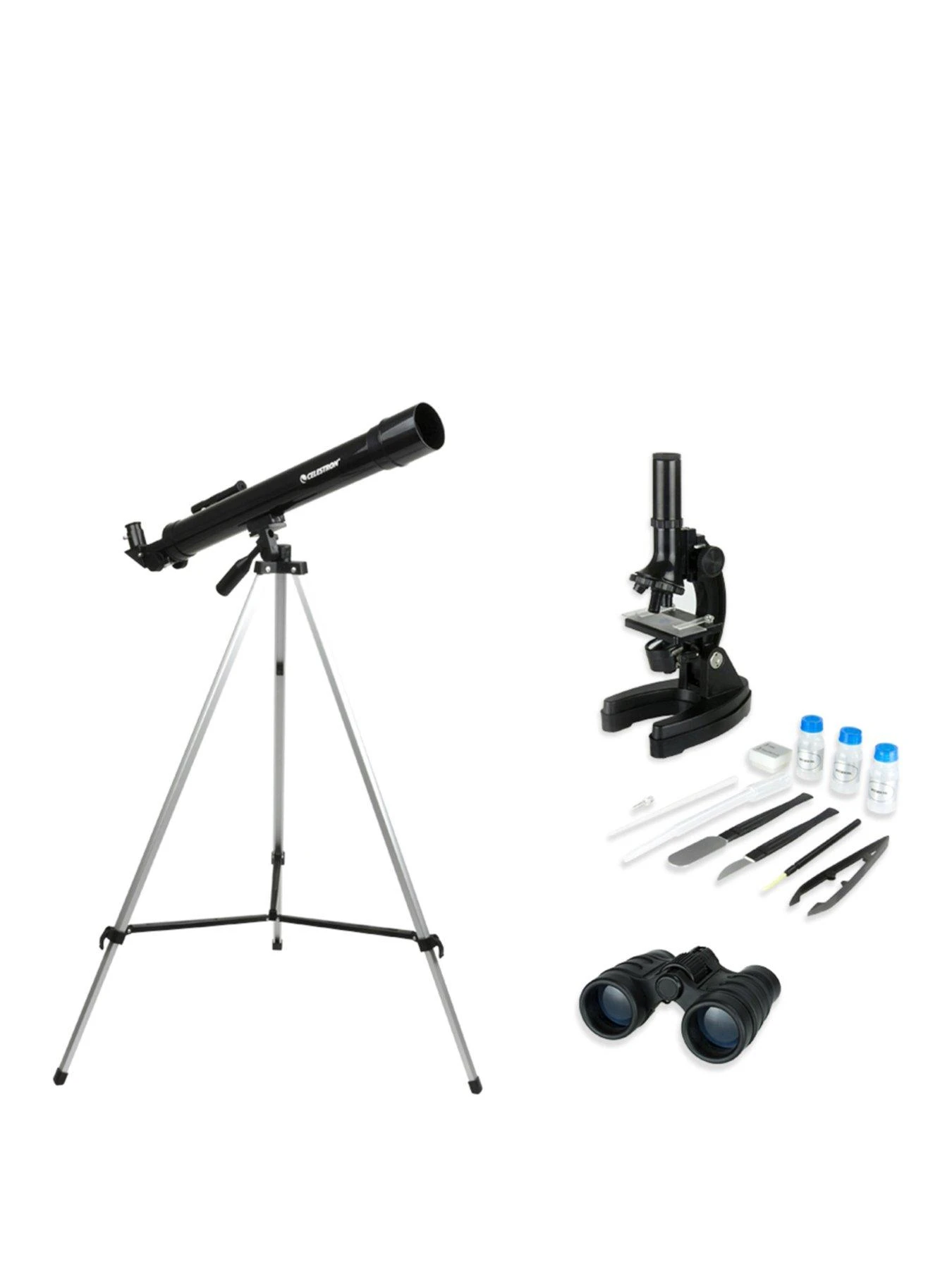 Included in this 3-piece Celestron set, you’ll find a telescope with a full height tripod, binoculars and a microscope.