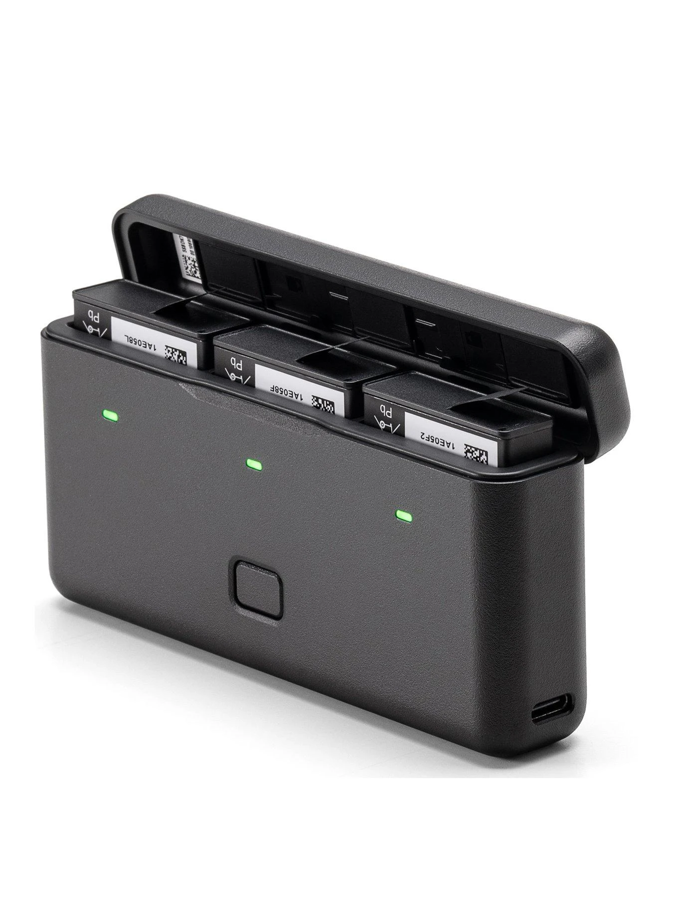 Stores three batteries and two microSD cards. Intelligently fast charges three batteries, and can be used together with those batteries as a power bank to charge other devices like your smartphone.
