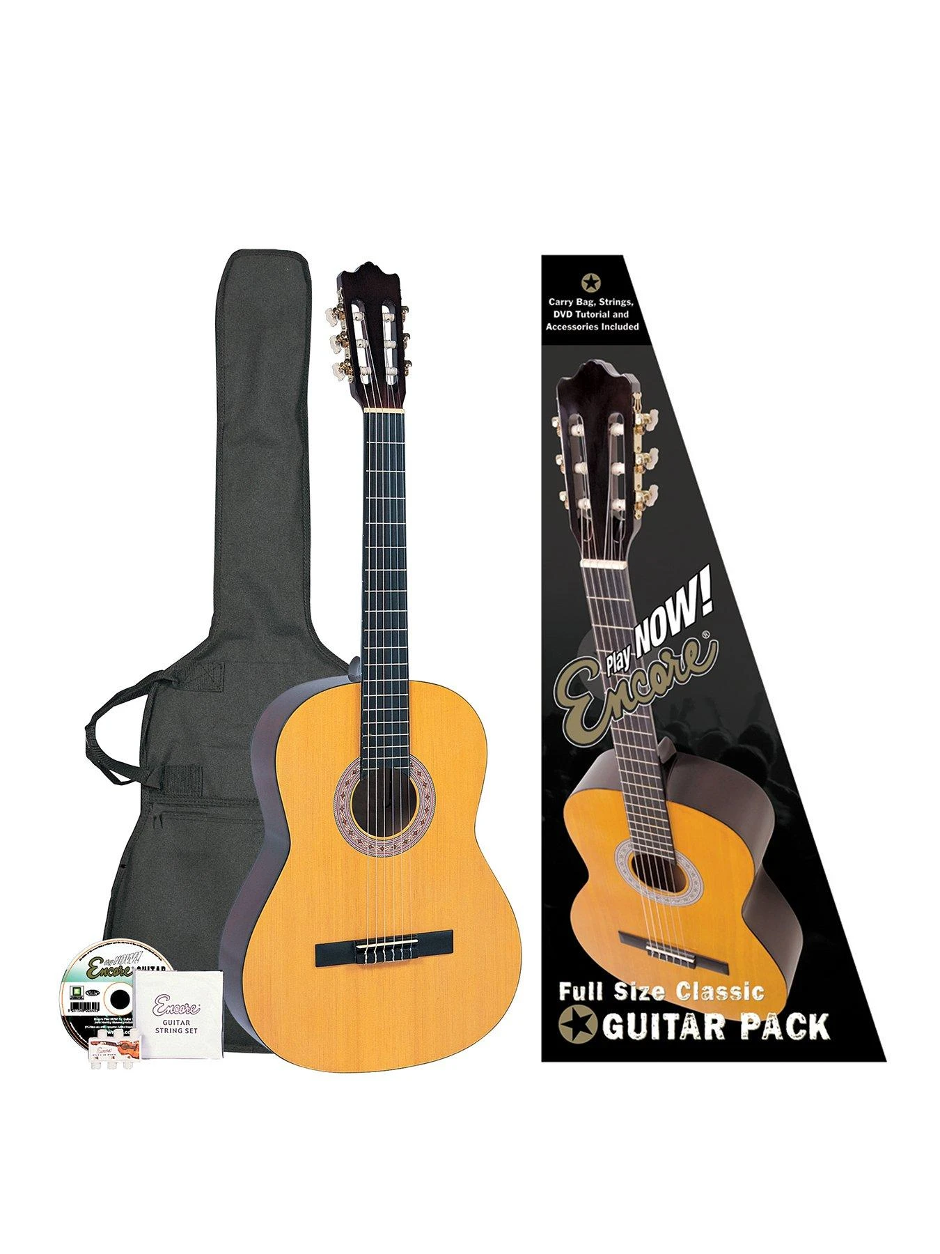 A household name in great value, great playing instruments, strings and accessories, Encore continues to provide beginners and students around the world with a quality instrument that will encourage them to start, and keep playing! Encore’s accessory-laden ‘Play Now’ outfits are the best, first guitar anyone can own. Looking for a guitar suitable for a present, or just to give to your children to get them started on a six string classical style guitar? Though aimed at the new starter the Encore Classic guitars look and feel like so much more. With a beautiful finish and intricate rosette design around the sound hole you will feel proud to start your musical journey on such an instrument The Encore Classic Guitar outfit are designed to help any player of any age begin their musical journey and progress to a great standard. Reliable and great sounding you will just want to keep performing All the accessories you will need to get up and running with the Encore guitar are supplied in the pack including: Guitar Carry Bag, Encore Set of Strings, Pitch Pipe, Tutorial DVD