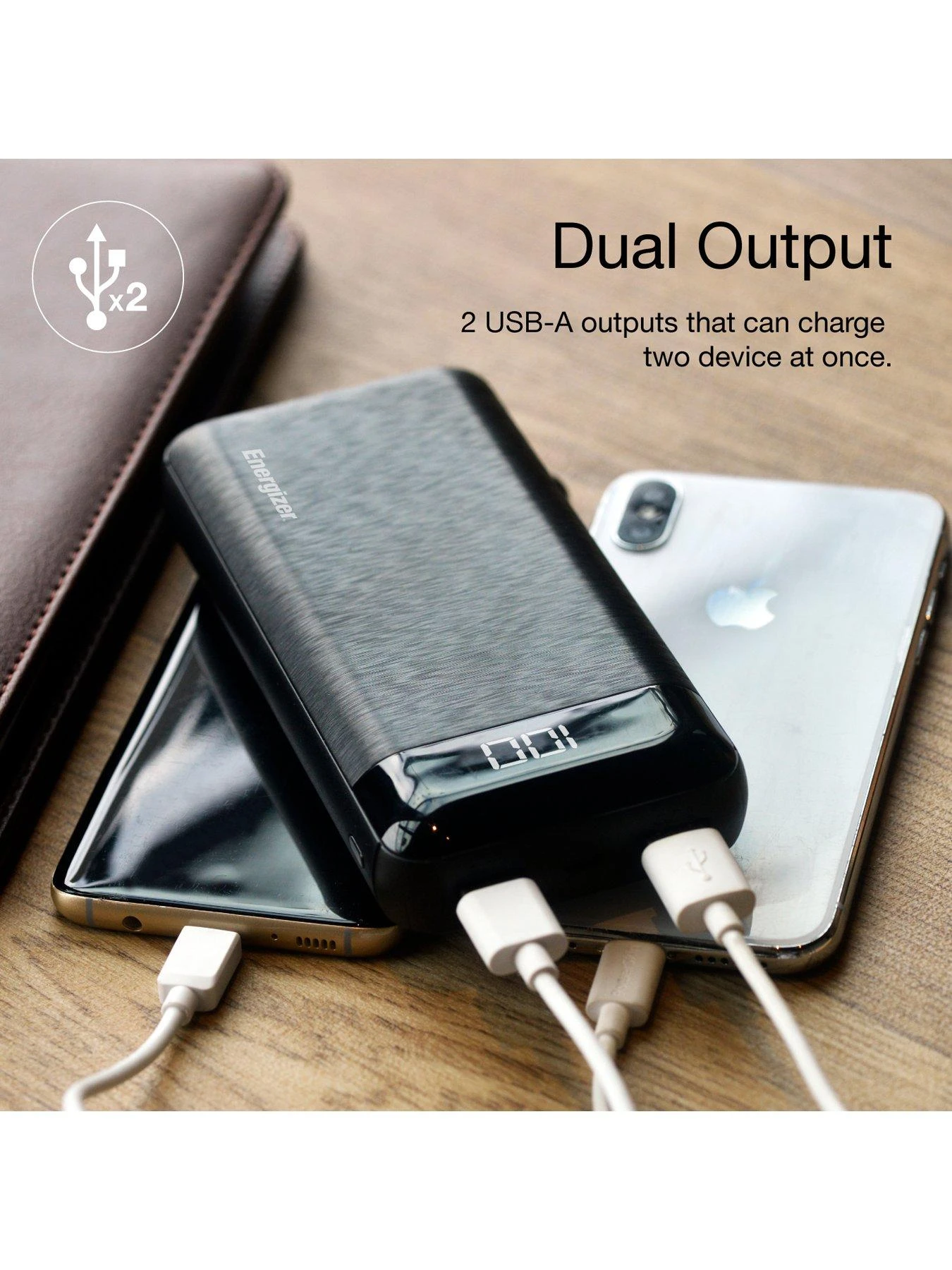- Dual Outputs 2 USB-A output ports that can charge 2 devices at once.