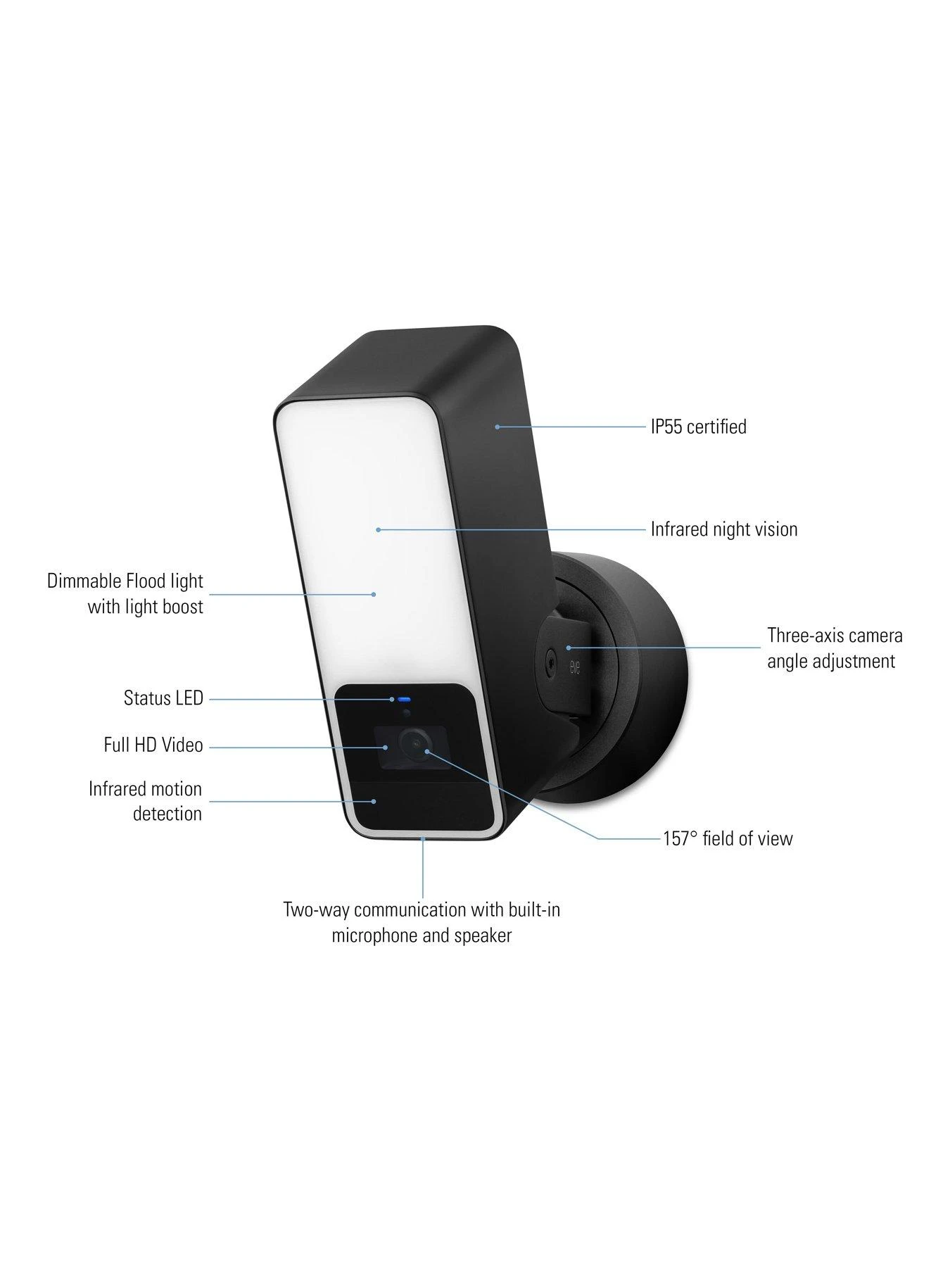 - Powerful, dimmable floodlight with light boost and infrared motion sensor; 157° field of view with night vision; HD (1080p/24fps) video