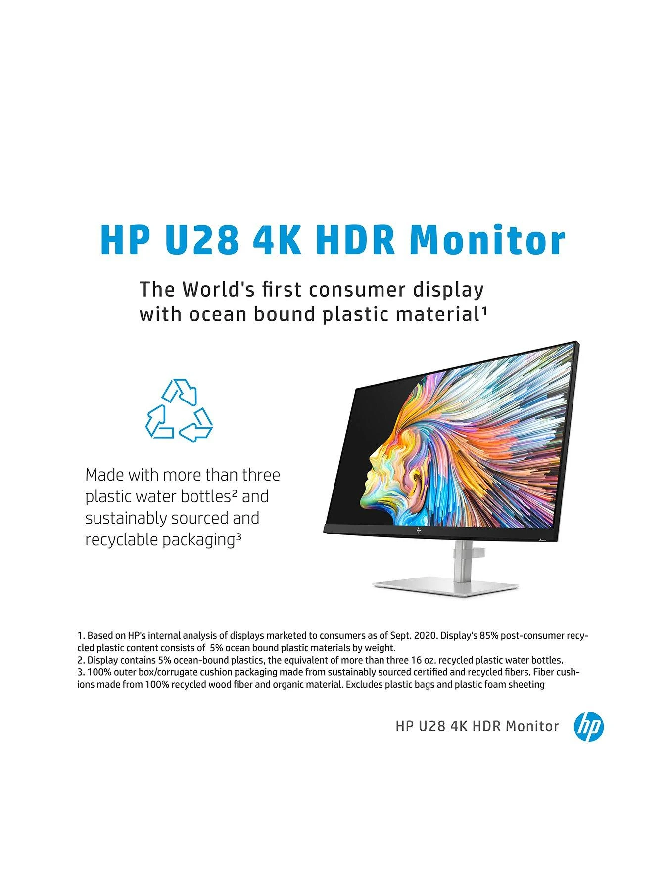 The HP U28 4K monitor is built with recycled ocean-bound plastics equating to more than 3 plastic water bottles. Even the packaging is sustainably sourced and recyclable.