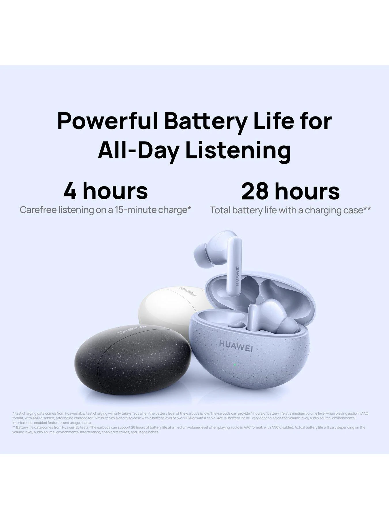 Enjoy up to 28 hours of music playback when used with the charging case. And there’s no need to worry when your HUAWEI FreeBuds 5i earbuds aren’t fully charged as you can get an extra 4 hours of audio on a mere 15-minute charge.