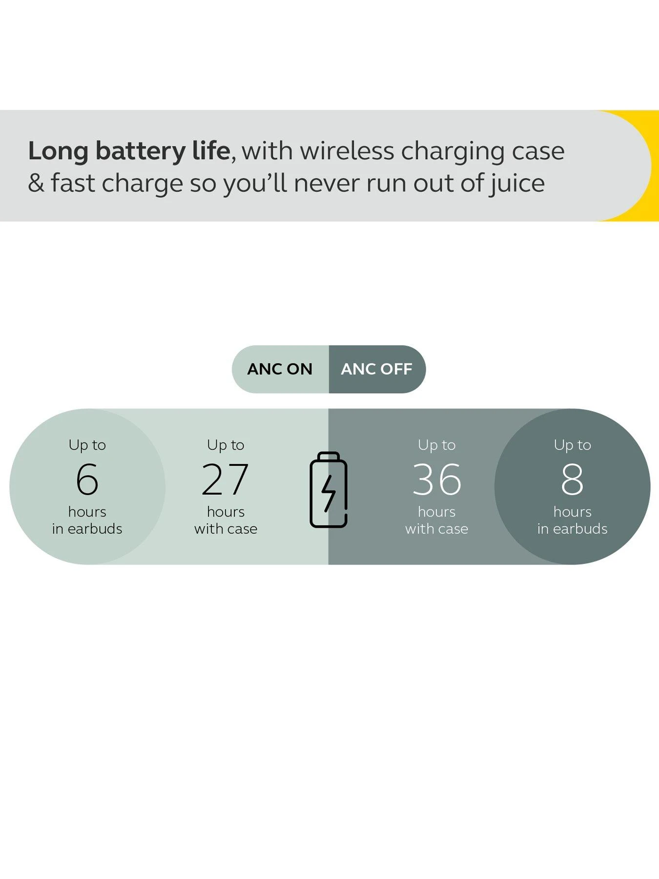 - Up to 6 hours in the earbuds, 27 hours with wireless charging case. And with fast charge, you’ll never run out of juice.