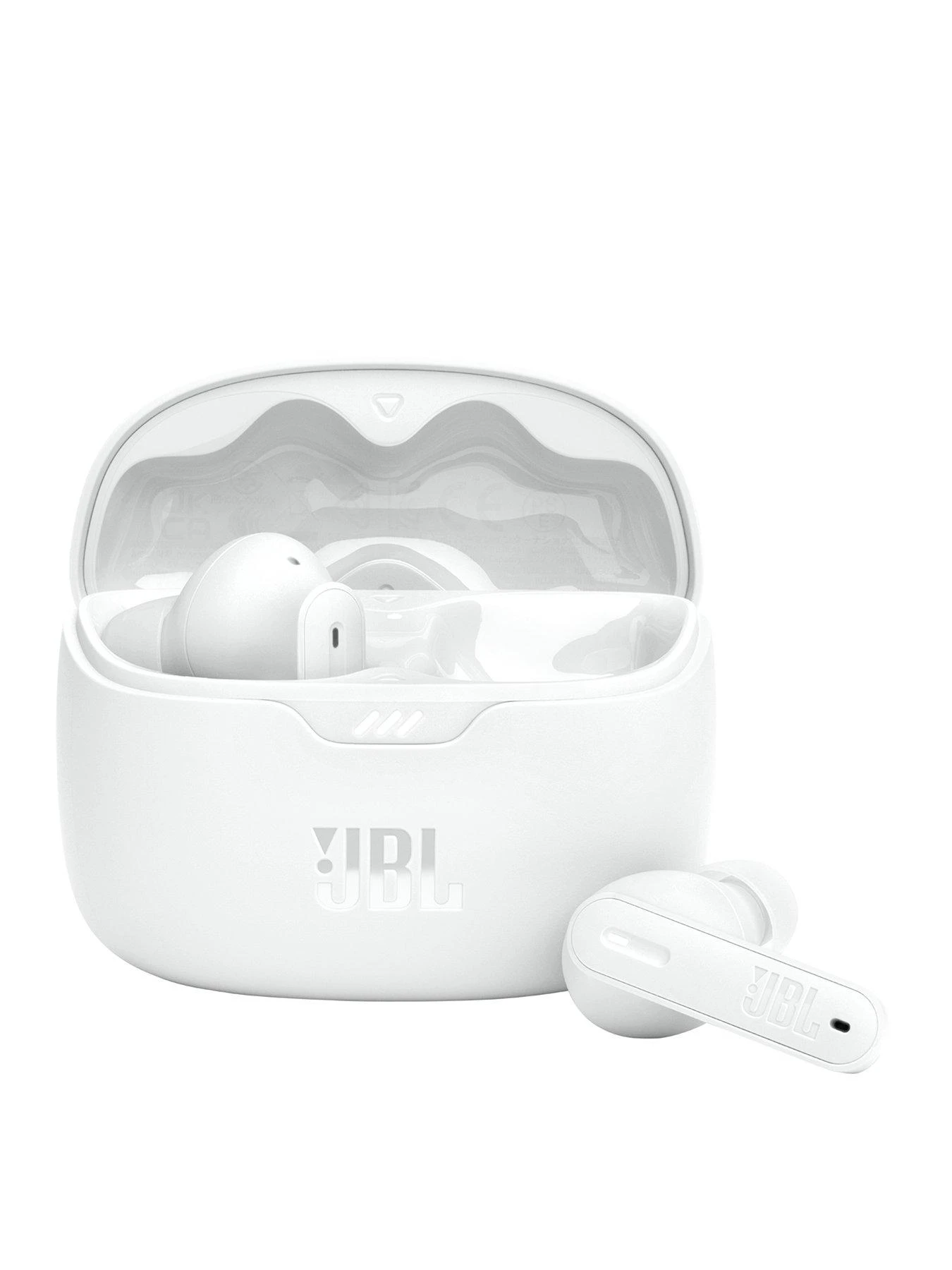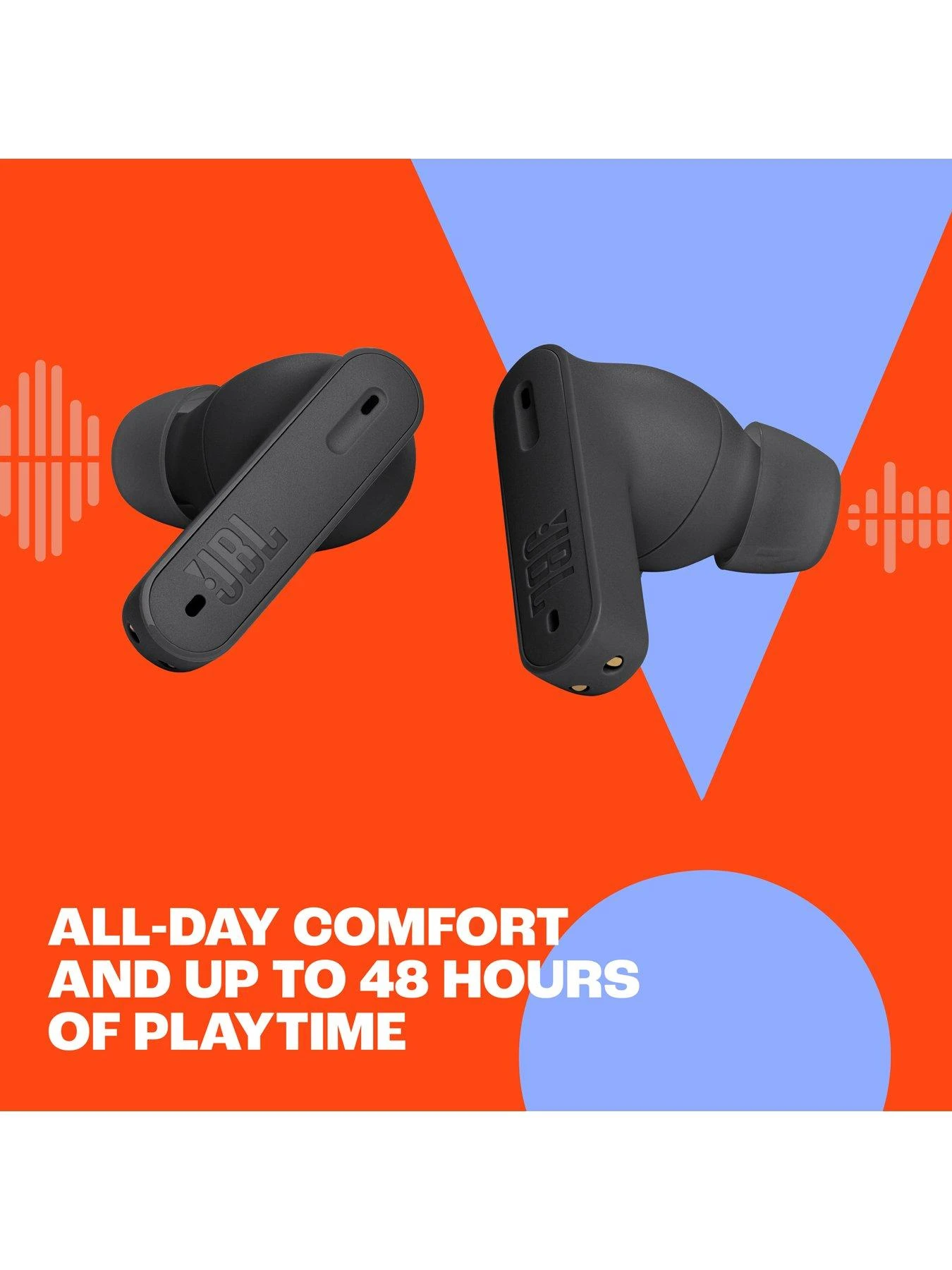 The JBL Tune Beam true wireless earbuds give you up to 48 hours of exceptional JBL Pure Bass Sound, while the ergonomic, IP54 water and dust resistant design gives you all-day comfort in any weather.