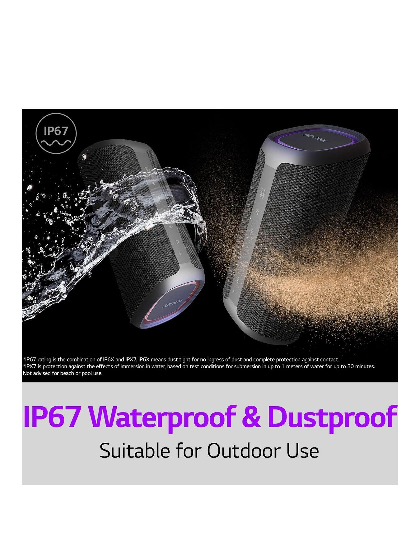 You can go anywhere with your LG XBOOM Go and get the party started any time, any place – including the great outdoors. With IP67, it can withstand water and dust so you never have to worry about keeping the music going.