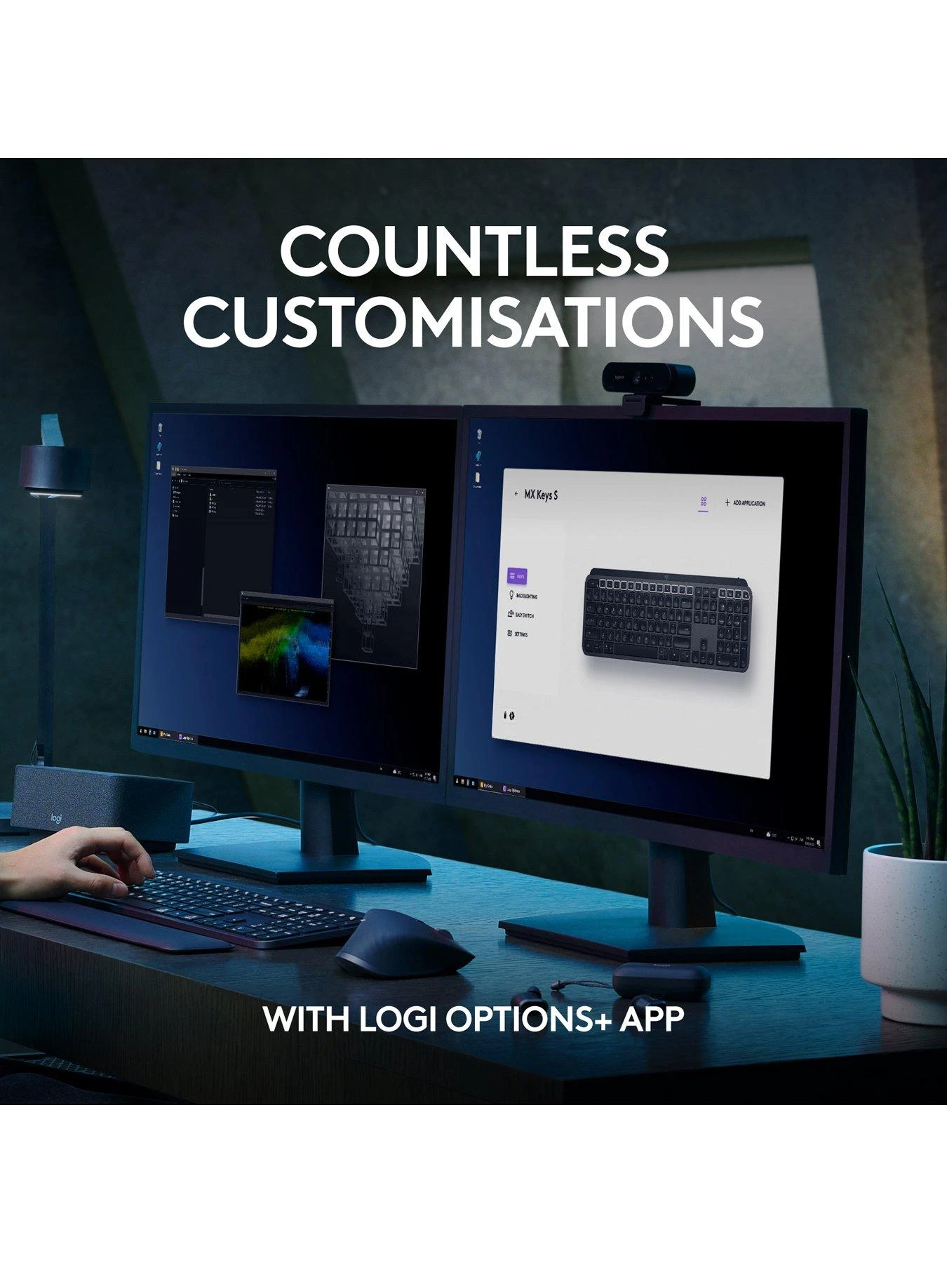 MX Keys S also features smart backlighting that lights up as your fingers approach the keyboard and automatically brighten or fade to suit the time of day. Now you have more control of your backlighting brightness and duration with Logi Options+.