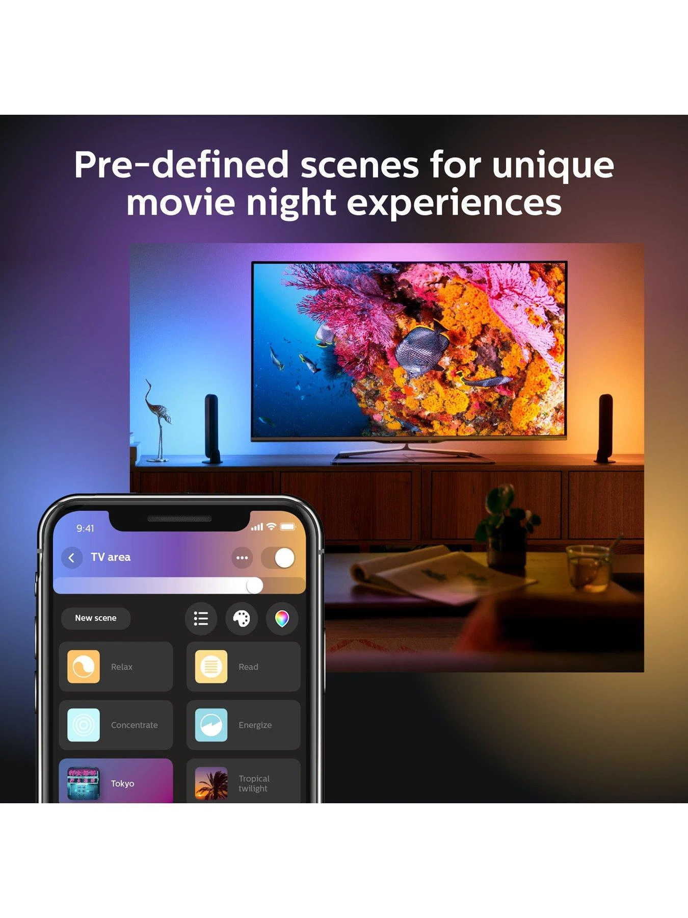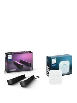This Play light bar 2-pack, which includes two light bars and a power supply that connects up to three lights, can be stood upright, laid down or placed onto the back of your TV with the included mounts  combined with a Hue Bridge allows you to unlock the full suite of smart lighitng feature