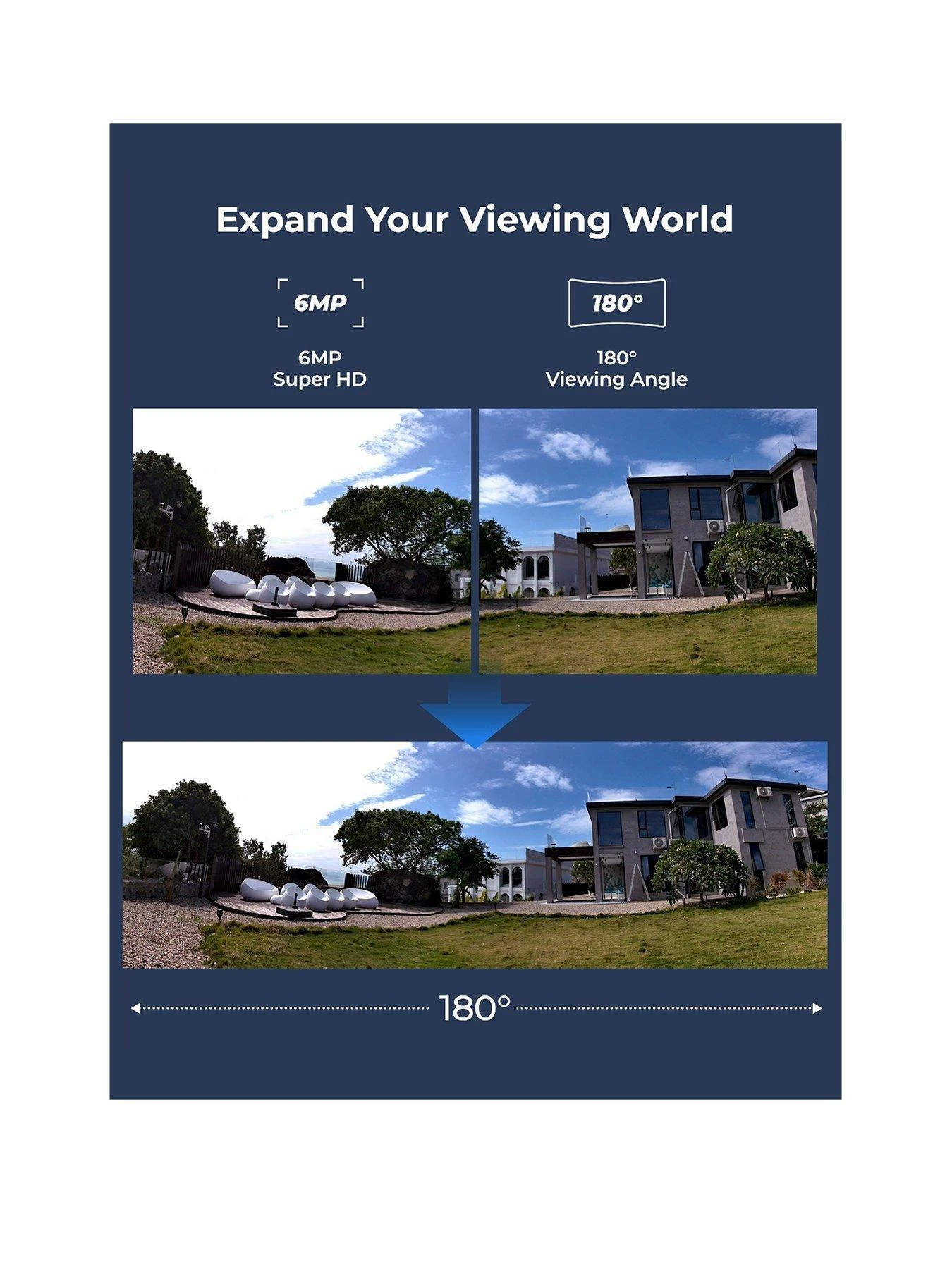 - 6MP Ultra HD with 180° Panorama view — Two Cameras in One. This camera stitches two views into one with no gap.