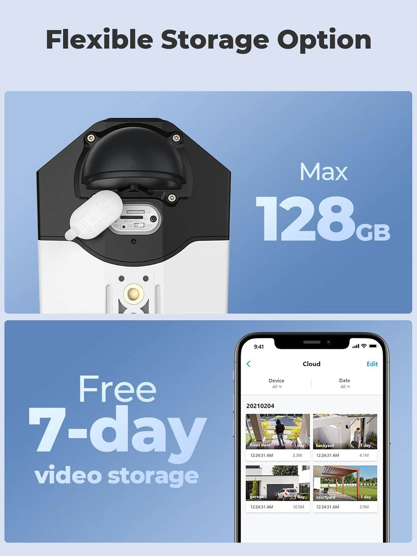 More efficient than H.264, the H.265 high-efficiency video coding allows Duo 2 to save half the bandwidth and storage space when recording and storing videos. The included 64GB microSD card provides local storage and you can also use cloud storage options for you to play back anytime, anywhere. Reolink Cloud is encrypted and offers free 7-day rolling video history.