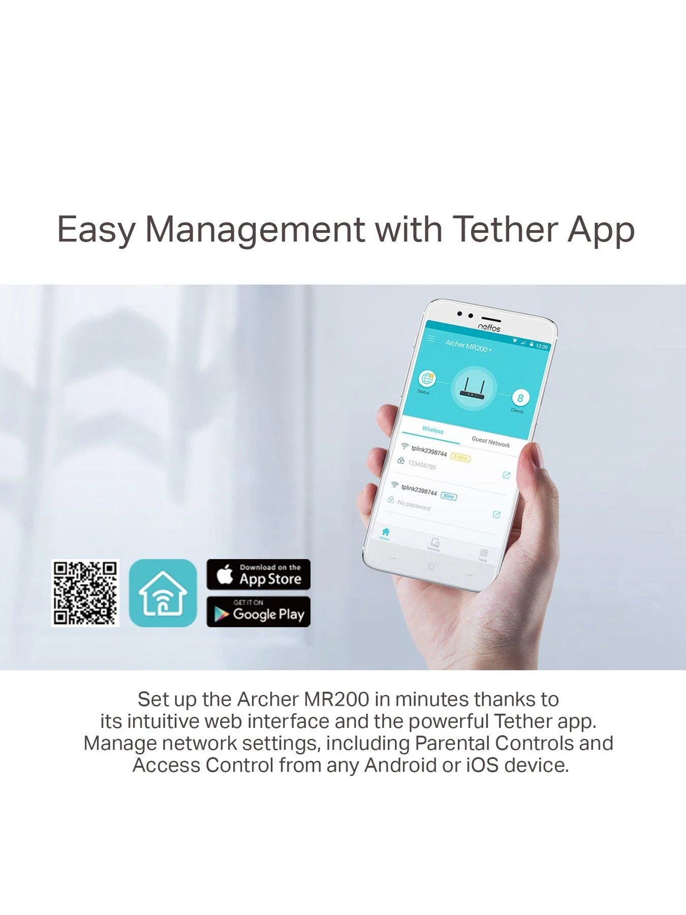 TP-Link AC750 Dual-Band Wi-Fi 4G LTE Router The Archer MR200 4G Router has the speed to work smoothly with almost any bandwidth intensive application including VoIP, HD streaming, or online gaming, without the lag. You can easily establish a reliable personal dual-band Wi-Fi hotspot on the move by simply inserting a SIM card. Instantly share 4G/3G connectivity with up to 64 wireless devices like tablets, laptops and mobile phones at the same time. It can also provide Internet access for desktop computers via the LAN/WAN ports. With the tpMiFi App (iOS/Android), you can easily access and manage the M7650 from your connected iOS/Android devices. The tpMiFi app allows you to establish data limits, control which devices can access your Wi-Fi, send messages, and share media files to/from a removable Micro SD card.