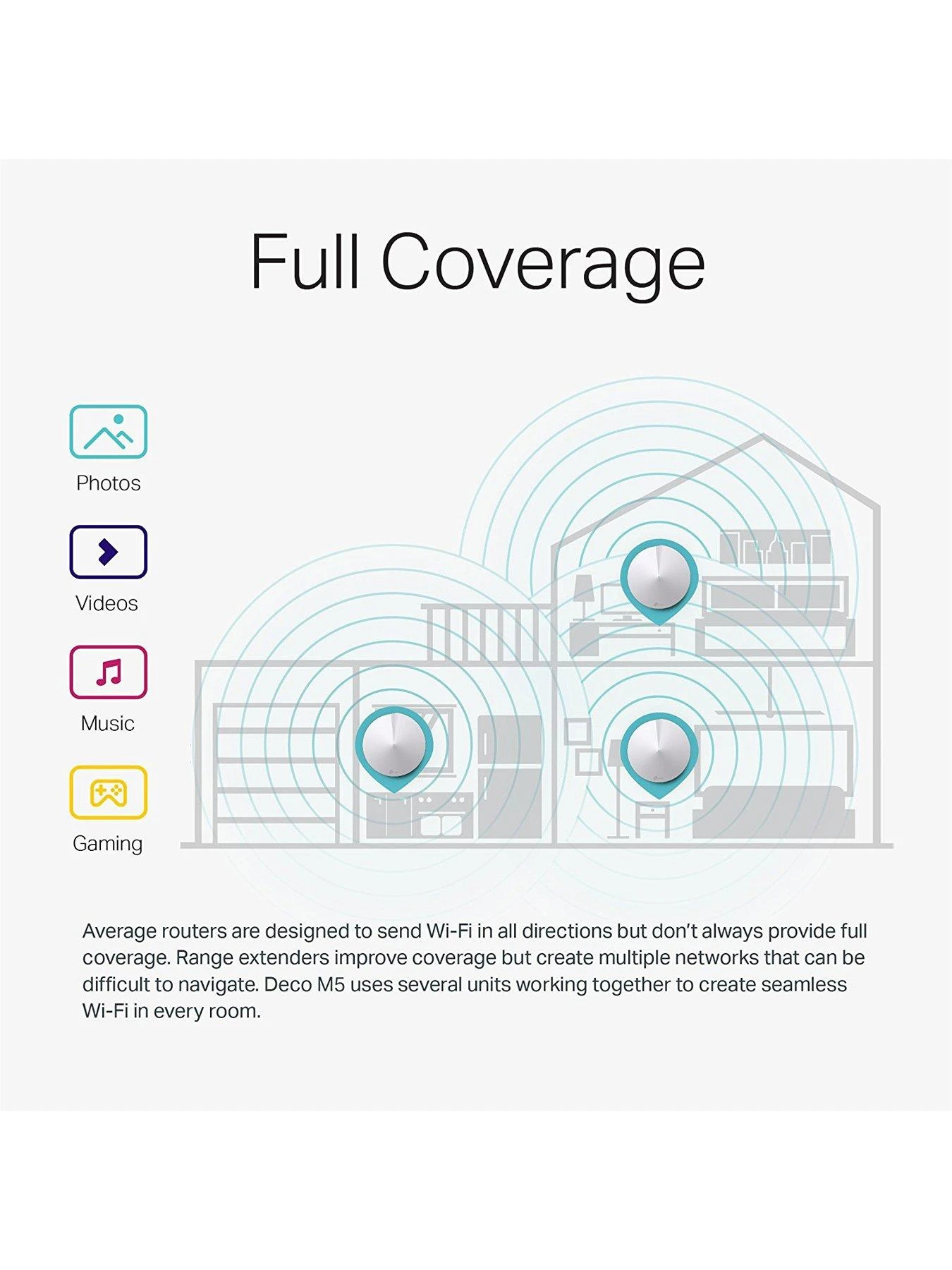 The TP Link Deco M5 (3-Pack) AC1300 Whole Home Wi-Fi Kit includes comprehensive security.