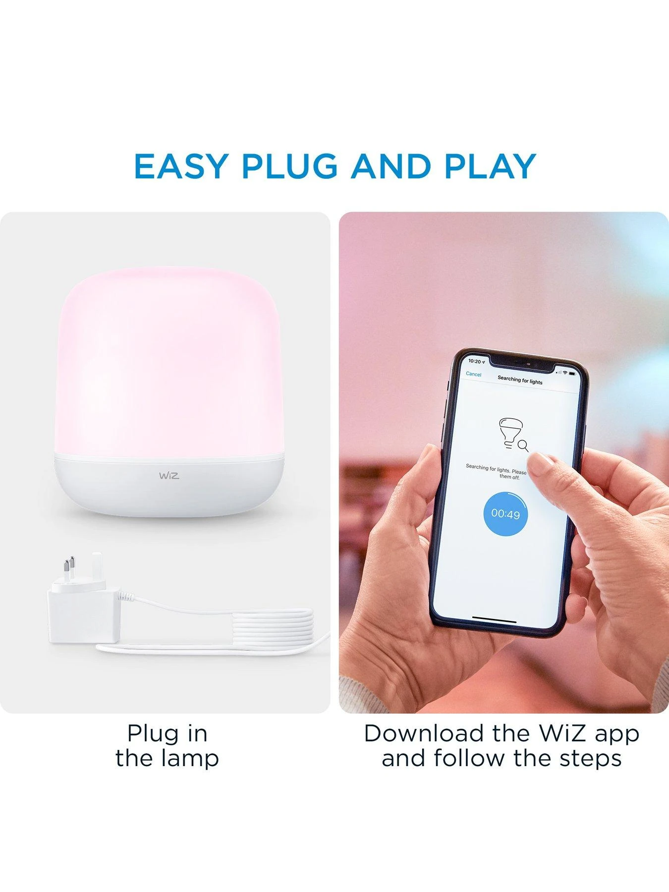 The subtle rounded design of the WiZ Hero table lamp lets you bring colorful smart light to any corner of your living areas. Use with the WiZ app or your voice to dim and brighten or use preset light modes on Wi-Fi setups.